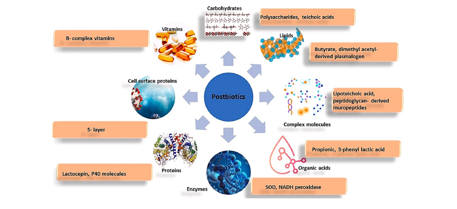 Освен това, постбиотиците съдържат и инактивираните (умишлено умъртвени) клетки на пробиотичните бактерии, наричани още лизати, както и техните структурни компоненти (клетъчни частици, частици от клетъчни стени, клетъчни биопродукти и пр.). Те представлявят много различни биологично активни вещества, като ДНК, РНК, ензими, цитоплазматични протеини, биосурфактанти, тейхоеви киселини, пептидогликани, полизахариди и пр., които също имат съществена полза за здравето.